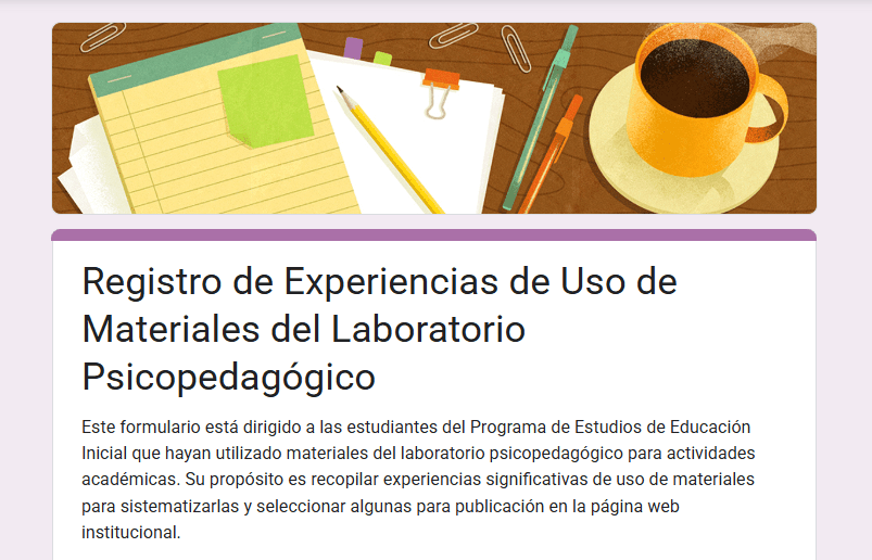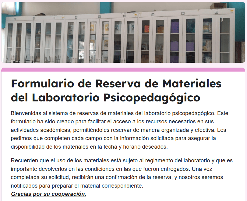 Haz clic en el enlace a continuación para acceder al formulario de reserva de materiales del laboratorio psicopedagógico. Este formulario permite a las estudiantes reservar los materiales necesarios para sus actividades académicas de manera organizada. Por favor, completa los campos solicitados para garantizar la disponibilidad del material en la fecha deseada.